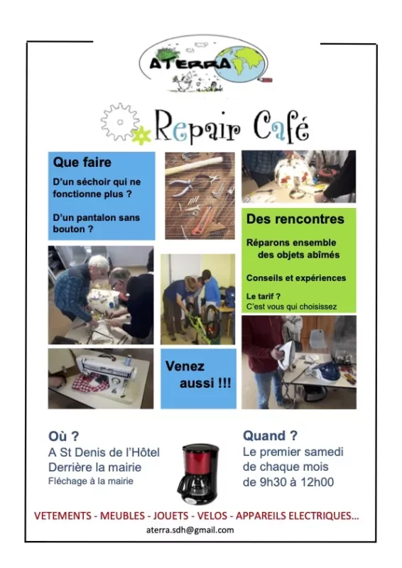 Un Repair Café est un atelier collaboratif de réparation où chacun peut venir avec un objet cassé pour tenter de le remettre en état, aidé par des bénévoles réparateurs. Ces ateliers ont lieu périodiquement dans des lieux conviviaux : cafés, salles associatives, maisons de quartier… L’objectif est double :